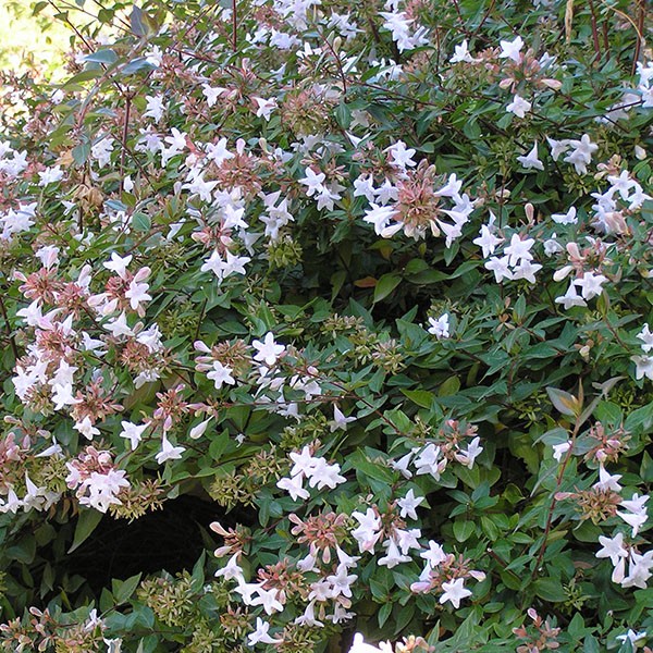 La abelia es un arbusto de hasta tres metros de altura, de un follaje muy atractivo y multitud de pequeñas flores que perduran un tiempo considerable, a lo largo del verano y el otoño. Es perenne salvo en las zonas frías, donde puede perder las hojas. Sus ramas arqueadas y extendidas pueden alcanzar una longitud de entre 1,5 y 1,8 metros. Suele usarse como seto o para formar grupos tupidos de arbustos.