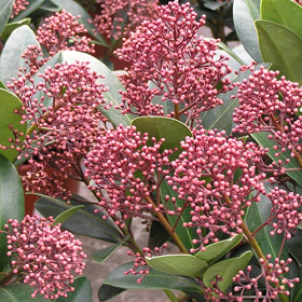 En el caso de la Skimmia, la belleza está bien repartida, incluso a lo largo del año, entre los pies masculinos y femeninos. Las flores masculinas surgen en invierno en forma de panículas de pequeños botones rojos muy decorativos, que en primavera dan paso a flores estrelladas de color blanco crema, fragantes y melíferas. Las flores de los pies femeninos, en cambio, son insignificantes, pero a partir del otoño producen llamativos ramilletes de bayas rojas que duran varios meses (son tóxicas).