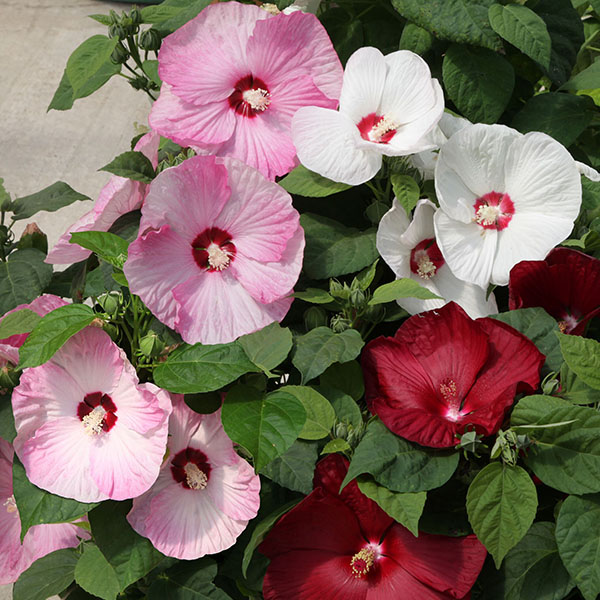 Las plantas son redondeadas —suelen alcanzar entre 0,90-2 m de altura y 0,60-1,20 m de ancho—, de aspecto arbustivo y muy frondosas, con hojas ovales o lanceoladas de 7,5 a 20 cm de largo, enteras o con tres o cinco lóbulos. El follaje puede ser verde, como en los cultivares ‘Honeymoon’ (en la foto), o con tintes burdeos, como en ‘Summerific Perfect Storm’, cobrizos o bronce. Las corolas están formadas por cinco pétalos superpuestos de color blanco, crema, rosa pálido o intenso, o carmesí, con una llamativa mancha central en la que destaca la prominente columna estaminal típica de los hibiscos y un largo estilo. Duran uno o dos días, pero a cambio su producción es continua y copiosa: en el pico de la floración, una planta madura puede producir a diario 20 o más flores. Son muy atractivas para los polinizadores. El específico moscheutos alude a su olor a almizcle. Existen numerosos cultivares; en algunos de ellos, como los del grupo ‘Southern Belle’*, las corolas pueden alcanzar 25 cm de diámetro.