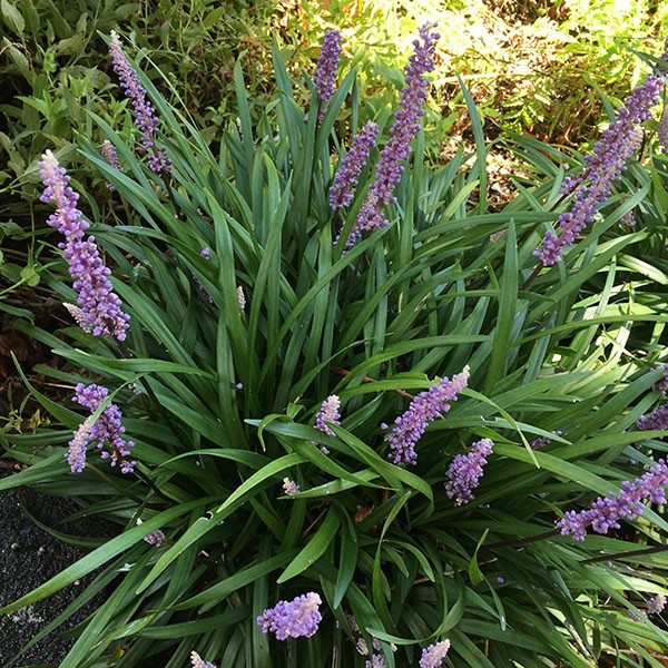 Sus largas hojas acintadas y la forma de fuente de las matas le dan una apariencia de hierba o gramínea ornamental, pero el Liriope muscari* es en realidad pariente de bulbosas tan conocidas como los jacintos y los muscaris o nazarenos. Precisamente su nombre específico, muscari, alude al parecido de sus inflorescencias a las de esta bulbosa. La floración se inicia a finales del verano y va seguida de pequeñas y brillantes bayas de color negro al madurar. Es una vivaz de fácil cultivo que disfruta de la sombra —sobre todo en los climas más cálidos—, ideal para plantar al pie de los árboles o en las zonas más umbrosas del jardín o la terraza. Es muy rústica, pero con el frío intenso puede perder el follaje para rebrotar en primavera. Se adapta a un gran abanico de temperaturas y resiste la sequía una vez establecida. Arraiga sin dificultad y se expande mediante estolones a mayor o menor velocidad según las condiciones.