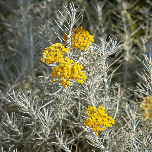 Sus hojas huelen a curry pero no forman parte de las mezclas de especias que componen este condimento. A su singular aroma, este elicriso originario del sur de Europa suma una serie de cualidades muy interesantes para los jardines de bajo riego, grava o costa: un aterciopelado follaje perenne gris plata, flores de un vibrante color amarillo desde el verano hasta la llegada del frío y, sobre todo, una total adaptación a las condiciones más duras del clima mediterráneo, los suelos más pobres, incluso calizos, y el aire salino del mar. Las matas de este subarbusto desarrollan una forma de cojín de unos 40 cm de altura por 50 cm de diámetro. Crece lentamente y no exige casi cuidados.