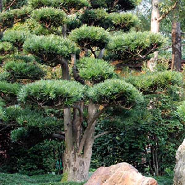 Nativo del sur de la China y Japón, el llamado tejo chino o kusamaki es una pequeña conífera muy ornamental, que suele alcanzar entre seis y 12 metros de altura. Recuerda al tejo por su follaje perenne en forma de hojas largas y finas y sus decorativos arilos rojos. El Podocarpus macrophyllus puede resistir -17º (zonas 7-11) y tolera la sequía una vez establacido. Crece lentamente; la variedad maki, la más utilizada, tarda unos 10 años en aproximarse a los dos metros de altura. Se lo considera virtualmente libre de plagas y hongos.