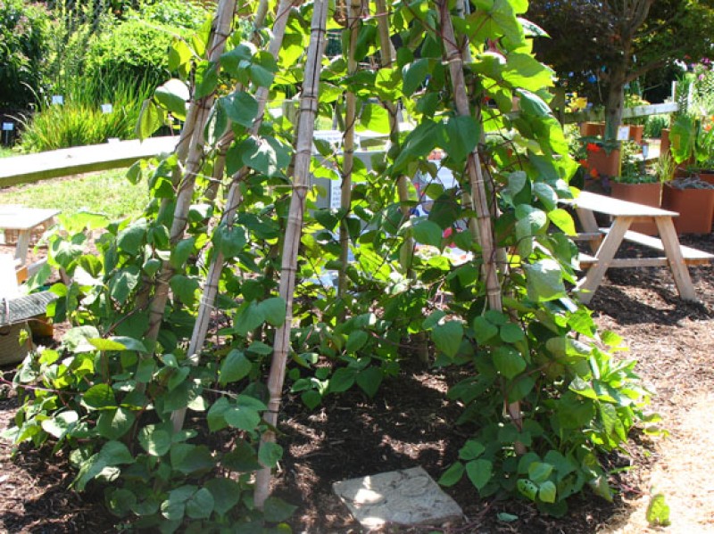 4. Entierra las semillas a la profundidad y distancia que indique el sobre; si usas planteles, nivela el terrón con el suelo. Planta al menos dos ejemplares por cada palo. Hazlo en la parte interior del tipi; así será más fácil escardar las malas hierbas más adelante. Si los intercalas con trepadoras de flor tendrás también color.