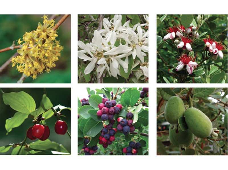 Arbustos de bayas comestibles y de bella floración: cornejo macho (fotos de la izquierda), amelanchier (centrales) y feijoa (derecha). Copyright: T. Waters, J. Mangelsdorf, A. Trnkoczy, J. Ochtersky, Ecos de Piedra.