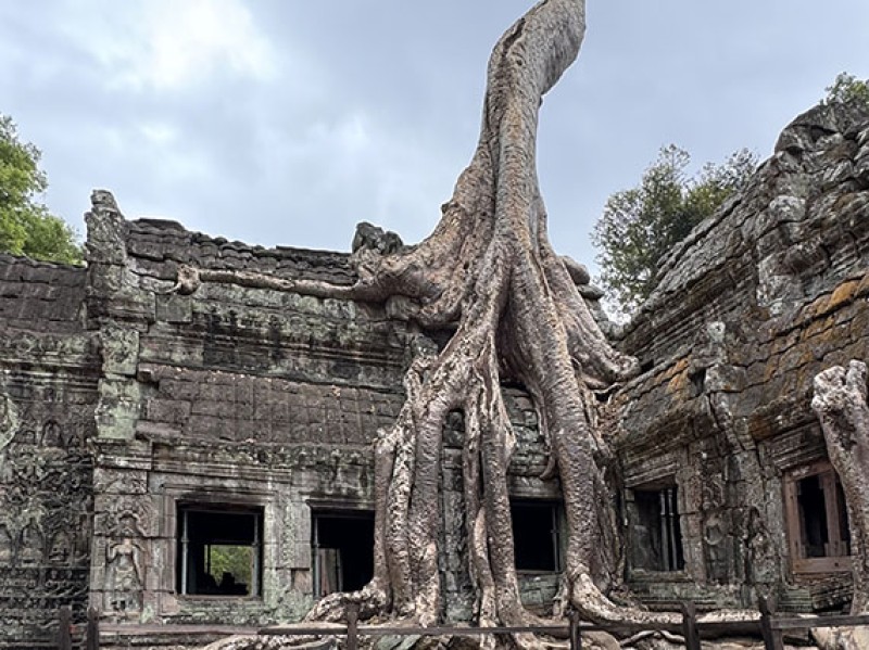 El gran árbol cuyas raíces se funden con el templo de Ta Prohm, en Angkor, empezó su lenta conquista de los techos y muros de arenisca en algún momento entre el abandono del complejo en el siglo XV y su descubrimiento a comienzos del siglo XIX invadido por la selva tropical. Es un spung, el nombre camboyano del Tetrameles nudiflora, un gigante de la jungla del Sudeste Asiático que puede alcanzar entre 25 y 50 m de altura y se dota de un poderoso contrafuerte para asegurarse estabilidad en suelos poco profundos, como los techos de un templo. En Ta Prohm, el mimetismo entre corteza y piedra impresiona tanto como la fuerza incontenible que expresan las raíces y el largo tronco que se eleva limpio más de una treintena de metros hasta rematar en una pequeña copa provista de pequeñas hojas caducas.