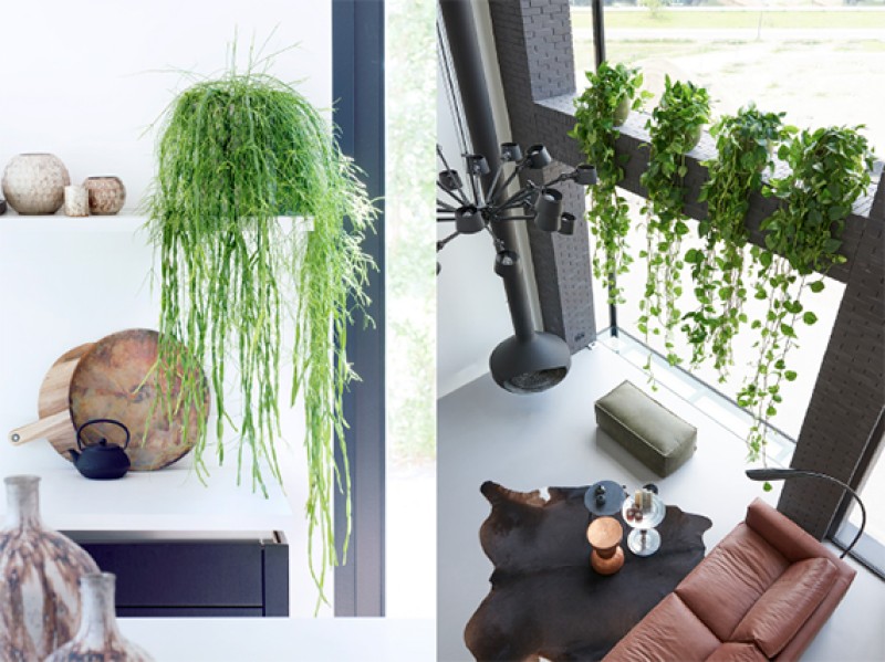Aprovecha la tendencia a colgar (o a trepar) de tantas plantas para crear el efecto de una cascada de hojas en tus ambientes de interior. Basta situar los tiestos en un lugar en altura para que los tallos caigan, o echar mano de las cestas colgantes e incluso de percheros u otro tipo de soportes verticales. Puedes instalarlas en el salón, el despacho, el cuarto de baño, la cocina... solo necesitan un espacio luminoso.