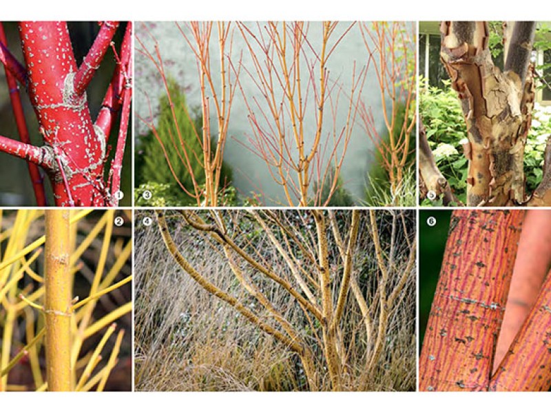 Las tonalidades de la corteza de este arce japonés recuerdan una llama: amarillas en la base de los troncos y anaranjadas y rosadas en la abundante ramificación.