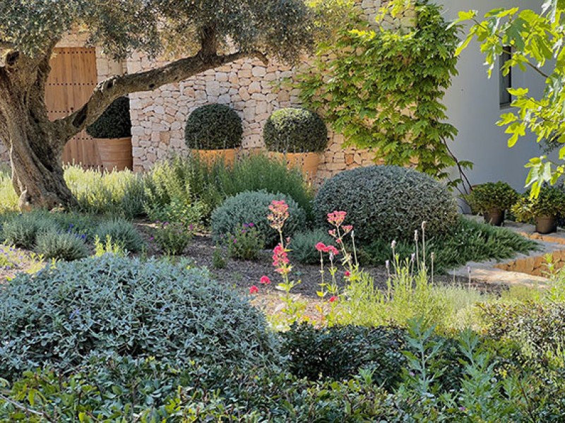 Son múltiples las razones que explican el éxito del Teucrium fruticans en la jardinería mediterránea y auspician la introducción de otras especies. “El follaje tiene unas tonalidades grises bellísimas, no da ni un problema, se desarrolla fenomenal, sin enfermedades, responde perfectamente a la poda y se pueden obtener formas bonitas, muy cerradas y compactas, o dejar crecer a su aire”, dice el paisajista Juan Masedo. “Para mí el teucrium es un perfecto comodín, una joya”. En sus jardines de Ibiza combina nubes y cojines de este teucrium arbustivo con otras especies mediterráneas como los lentiscos, romeros, la Westringia fruticosa, el Limoniastrum monopetalum de floración rosada… buscando una armonía cromática, de texturas y volúmenes globosos. Pero, además, lo utiliza como fondo permanente detrás de plantas pequeñas, o en macetas, tallado en forma de bola.