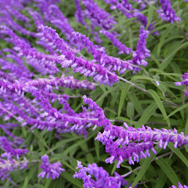 Su nombre común revela el país de origen de esta salvia que alcanza su máximo esplendor a lo largo del otoño e incluso el invierno con su floración en forma de grandes y densas espigas de 15-20 cm de largo. Las inflorescencias de la Salvia leucantha* surgen en lo alto de finos tallos que se arquean por su peso. En origen las flores son blancas, en dúo con el color amatista (salvia amatista es otro de sus nombres comunes) de los aterciopelados cálices, que mantienen el color incluso cuando se han secado. Es un subarbusto de afelpado follaje perenne que resiste mejor la sequía que otras salvias. Se considera de bajo riego y no exige casi mantenimiento.