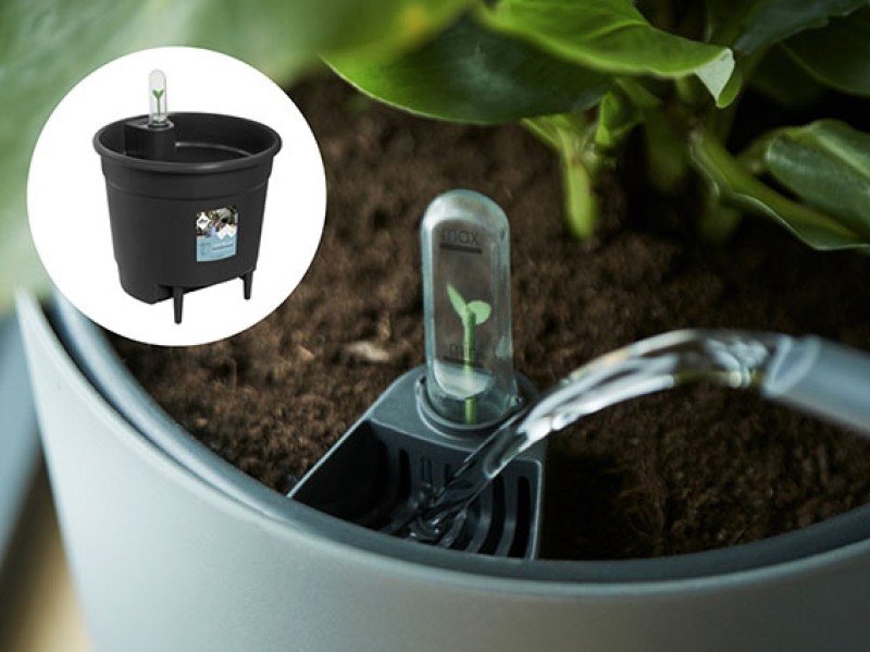 Los inserts de autorriego pueden convertir en hidrojardinera cualquier maceta convencional de interior o exterior, de terracota, cerámica, resina, plástico o metal, con el agujero de drenaje taponado, así como cestos y portatiestos. Simplemente se insertan en su interior. Cuentan con una zona de llenado que suministra agua al depósito ubicado en la parte inferior y un indicador de nivel de agua. En la foto de arriba a la izquierda, el Self-Watering Insert de Herstera, disponible en formato redondo y cuadrado en varias medidas. En la foro de arriba a la derecha, el insert de Elho, fabricado en plástico 100% reciclado y reciclable, compatible con todas las macetas de interior de la marca y otros maceteros. Es muy ligero y está disponible en varios tamaños: ø17 cm x 16 cm de altura, ø21 x 20 cm, ø24 x 22 cm, ø28 x 26 cm, ø33 x 31 cm, ø36 x 35 cm y ø43 x 39 cm.